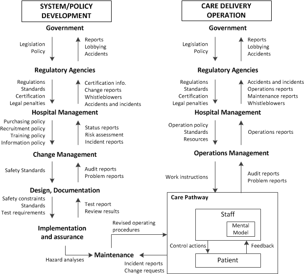 An example of a hierarchical safety control structure (here, for a healthcare system) illustrates multi-level feedback and control. Each level imposes constraints on the level below (downward arrows) and receives feedback on how well those constraints are being followed (upward arrows). In AI contexts, we similarly have technical, operational, and governance layers in constant communication to maintain safety.