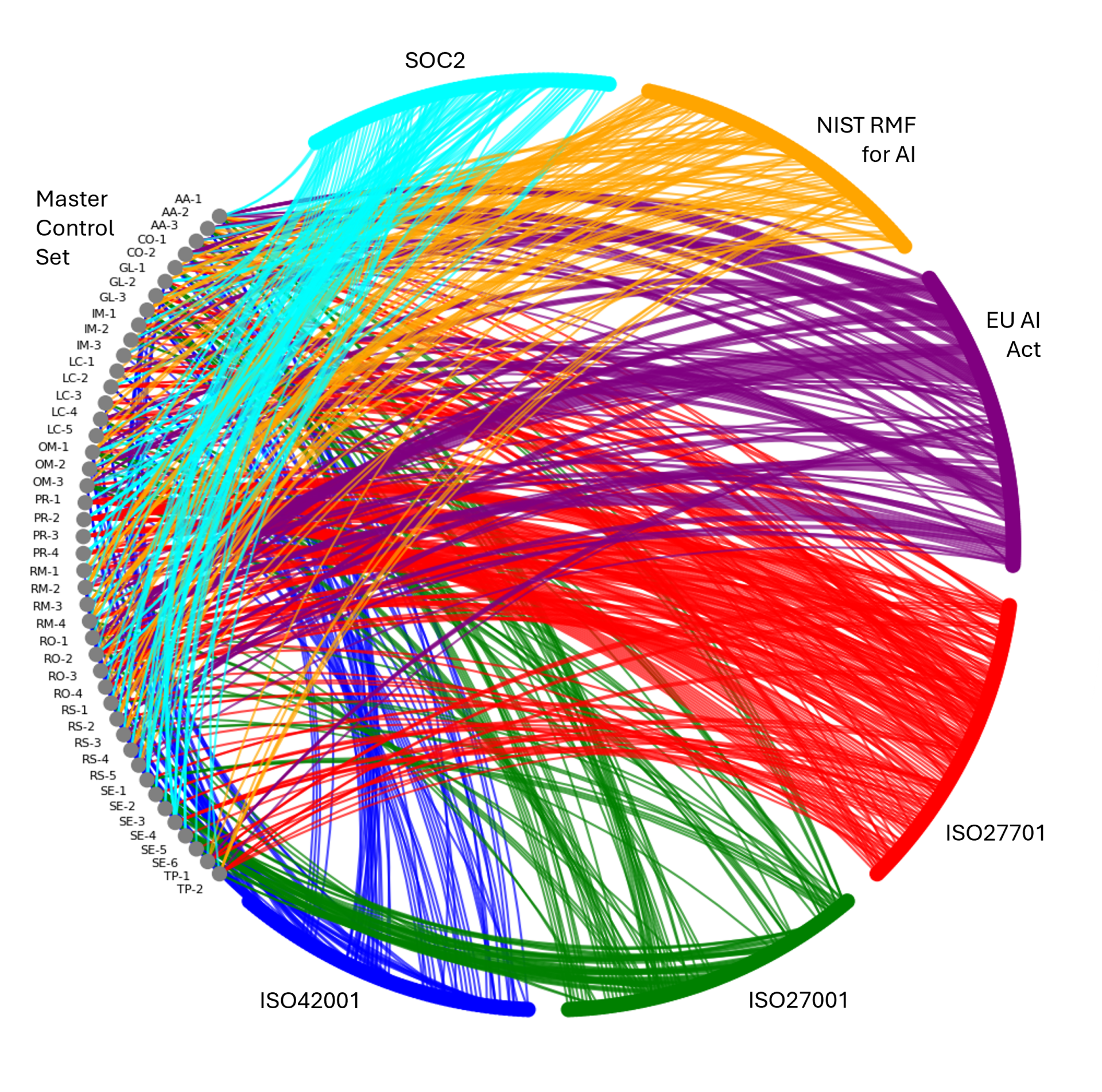 A crosswalk of master controls aligning ISO42001, ISO27001, ISO27701, the NIST Risk Management Framework, EU AI Act, and SOC2, for a real-world AI governance control framework.