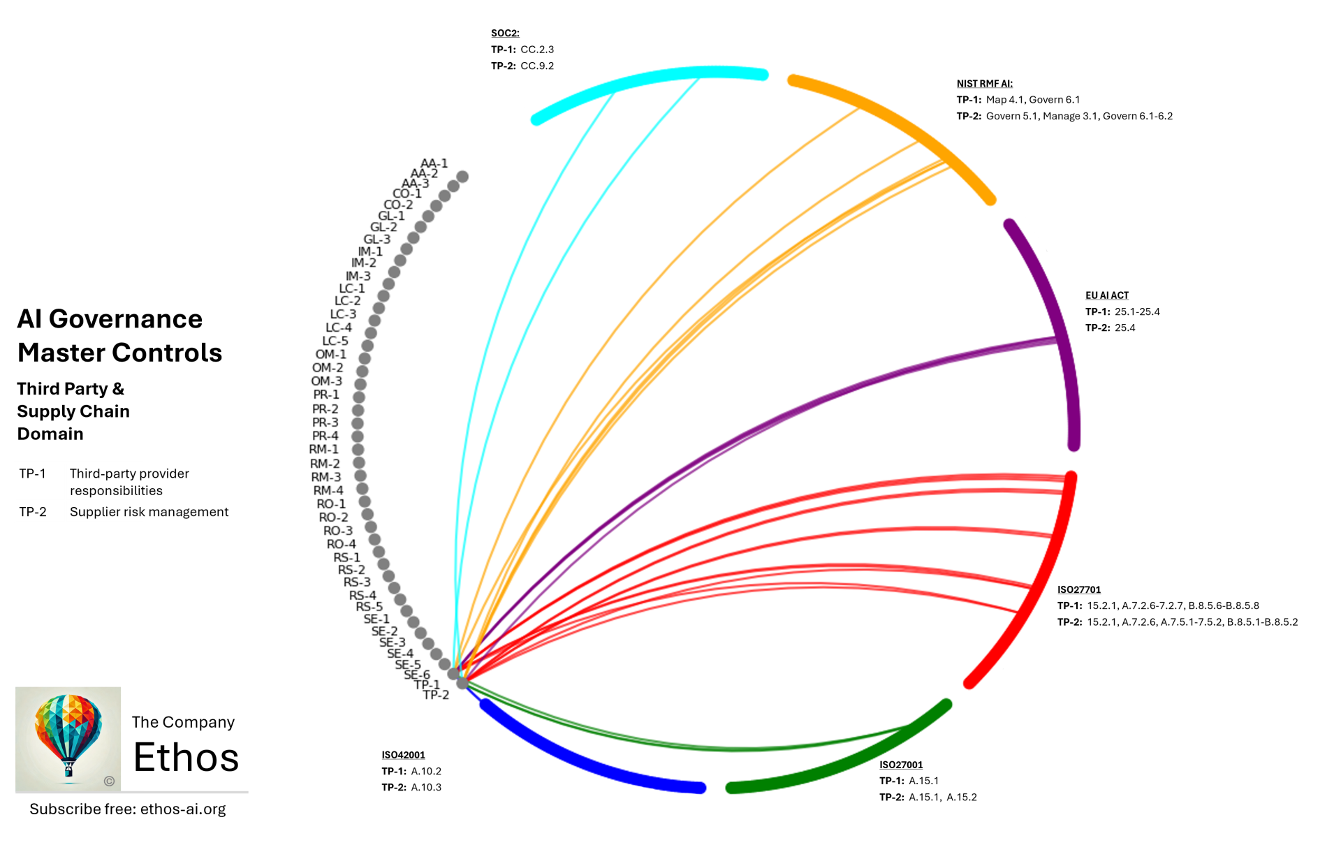 Third Party & Supply Chain management for AI systems represents a new frontier where the complexities of artificial intelligence intersect with traditional vendor oversight. Unlike conventional software procurement, where functionality is often well-defined, AI systems can involve multiple components—models, data pipelines, and infrastructure—sourced from various providers, each bringing unique risks. The frameworks — ISO 42001, ISO 27001, ISO 27701, the EU AI Act, NIST AI RMF, and SOC2 — all recognise that organisations must adopt more sophisticated processes to maintain clear lines of accountability, evaluate AI-specific capabilities, and continuously monitor supplier performance throughout the AI lifecycle. This requires a somewhat more engaged approach than traditional vendor oversight with allocation of clear provider responsibilities (TP-1) and robust supplier risk management processes (TP-2) that are far from annual fire-and-forget processes.