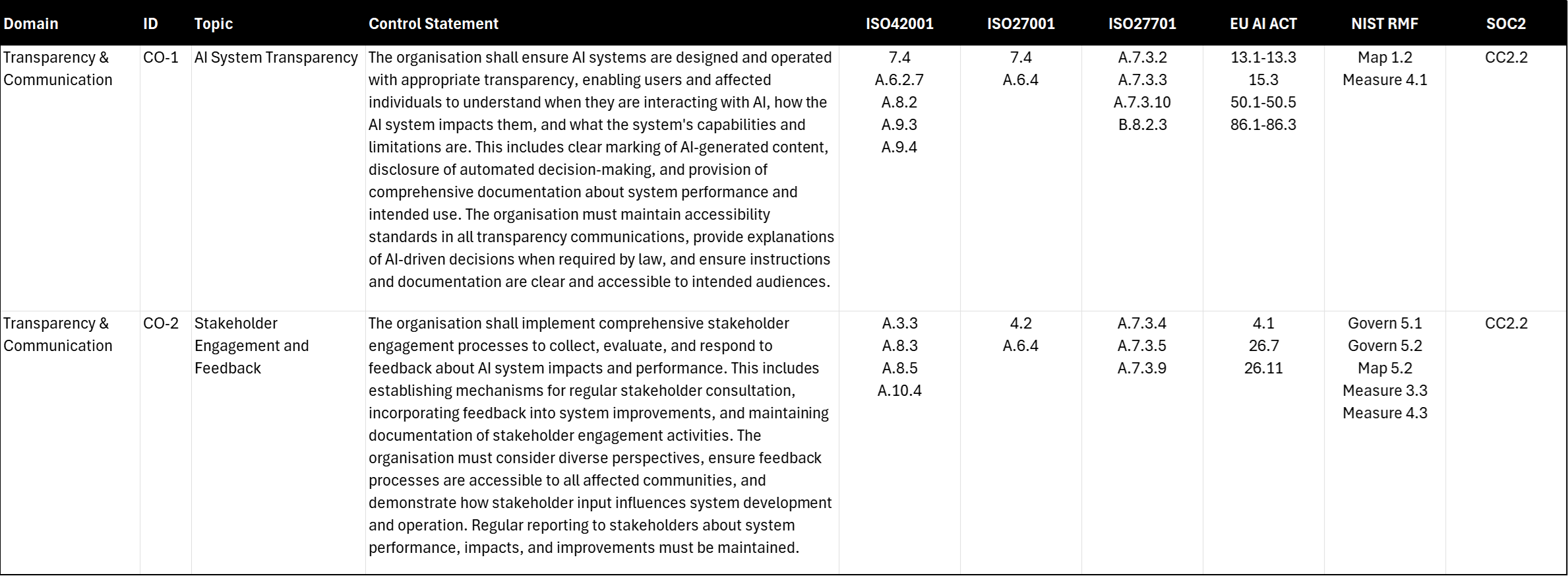 Transparency & Communication in AI systems goes far beyond merely listing features or providing usage documentation. Because AI decisions often involve probability-based reasoning and adaptive learning, organisations need to communicate not only what their systems do, but how and why they operate as they do. Frameworks such as ISO 42001, ISO 27001, ISO 27701, the EU AI Act, NIST AI RMF, and SOC2 emphasise that transparent communication fosters trust, clarifies responsibilities, and ensures that diverse stakeholders—from end users to regulators—can understand AI systems’ capabilities, limitations, and potential impacts. By establishing AI system transparency (CO-1) and engaging in active stakeholder feedback (CO-2), organisations can build an environment of trust and mutual understanding around their AI deployments.