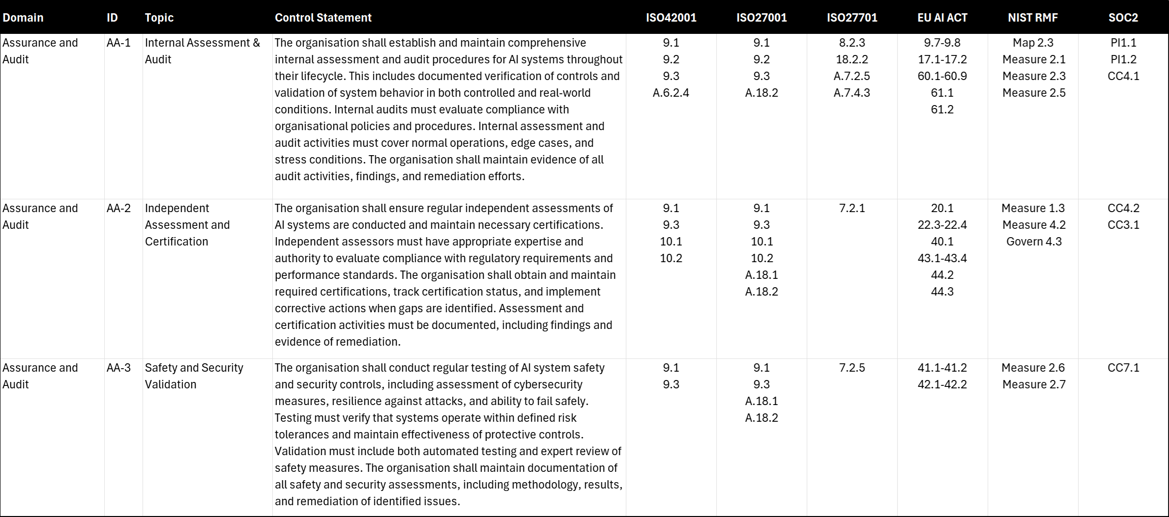 Assurance and Audit in the realm of AI goes well beyond traditional software verification or conventional annual audit cycles, demanding that organisations develop new methodologies and expertise to validate systems whose outputs are inherently probabilistic and whose behaviours may evolve over time. Frameworks such as ISO 42001, ISO 27001, ISO 27701, the EU AI Act, NIST AI RMF, and SOC2 converge on the principle that AI assurance must incorporate both rigorous technical evaluations and a broader consideration of societal impacts, ensuring that AI systems remain trustworthy, compliant, and aligned with organisational objectives throughout their lifecycle.