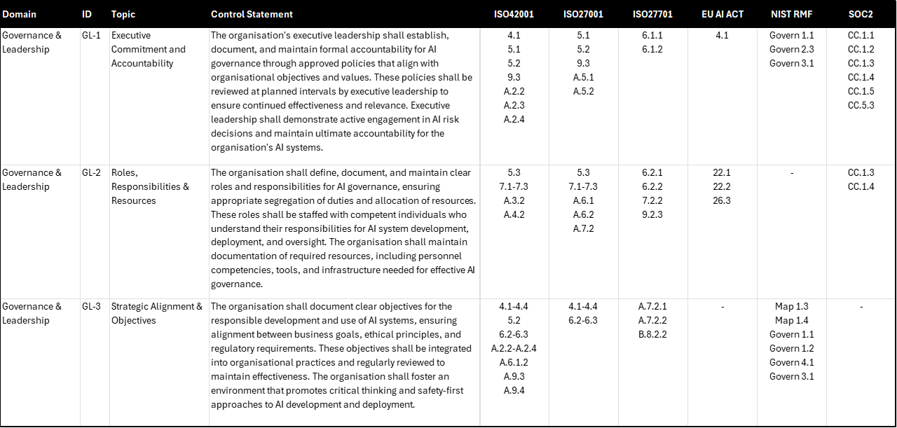Executive leadership commitment is emphasised in multiple standards such as ISO42001 (4.1, 5.1, 5.2, 9.3, A.2.2–A.2.4) and the NIST AI RMF (Govern 1.1, Govern 2.3, Govern 3.1). They highlight how critical it is to implement controls that ensure real executive oversight beyond paper policies into specific ongoing accountabilities. Notably, ISO 27001 (5.1, 5.2, 9.3, A.5.1–A.5.2) reinforces the role of leadership in setting clear direction and ensuring ongoing reviews, while SOC 2 Trust Criteria (CC.1.1–CC.1.5, CC.5.3) echo the need for documented accountability structures.