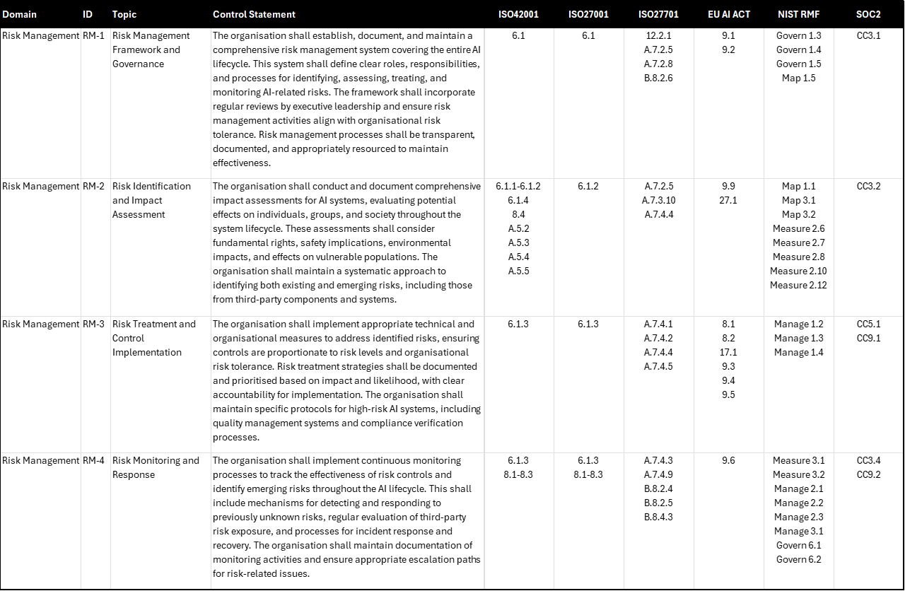 Risk management sits at the heart of responsible AI development, but traditional approaches can fall short when dealing with AI’s unique challenges. Unlike conventional software, AI systems can develop unexpected behaviours, exhibit subtle biases, or create unintended consequences that only emerge after deployment. This is why all of our six frameworks—from ISO/IEC 42001 (6.1) to the EU AI Act (Articles 9.1, 9.2)—emphasise the need for specialised, lifecycle-wide risk management frameworks, though they have a different interpretation of what risk means. ISO standards view risk in terms of uncertainty about achieving objectives, consistent with abroad interpretation of both upside and downside impacts, while the EU AI Act has a narrower interpretation of risk as harm. This distinction and the practices necessary for effective risk management of AI warrant a series of articles on their own (I’ll get to those as soon as we finish walking through control domains - stay tuned!)