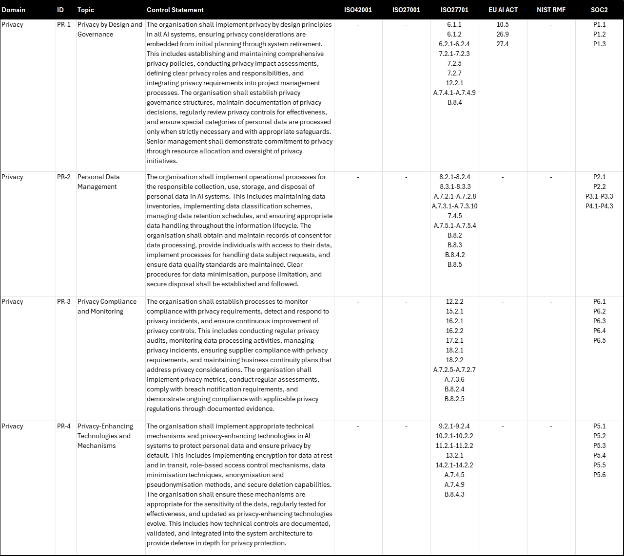 Privacy in AI systems represents a fascinating intersection of individual rights, technical innovation, and ethical responsibility. While many of the same principles from traditional data protection still apply, AI brings new complexities, such as the capacity to infer sensitive traits from seemingly benign data. Standards like ISO 27701 offer detailed guidance on integrating privacy into an organisation’s existing information security management system, while the EU AI Act calls for safeguarding personal data in high-risk AI contexts and emphasises transparency and accountability, while rightly leaving most privacy references to the already well established GDPR (I chose not to map to GDPR, largely because of the very strong overlap between ISO27701 and GDPR). SOC2 provides operational criteria much more focused on monitoring of control effectiveness. Taken together, although neither ISO27701 nor SOC2 make any specific reference to AI, they still provide a strong lifecycle approach to privacy that can be applied from initial data collection and model training to deployment, monitoring, and eventual retirement of AI systems.