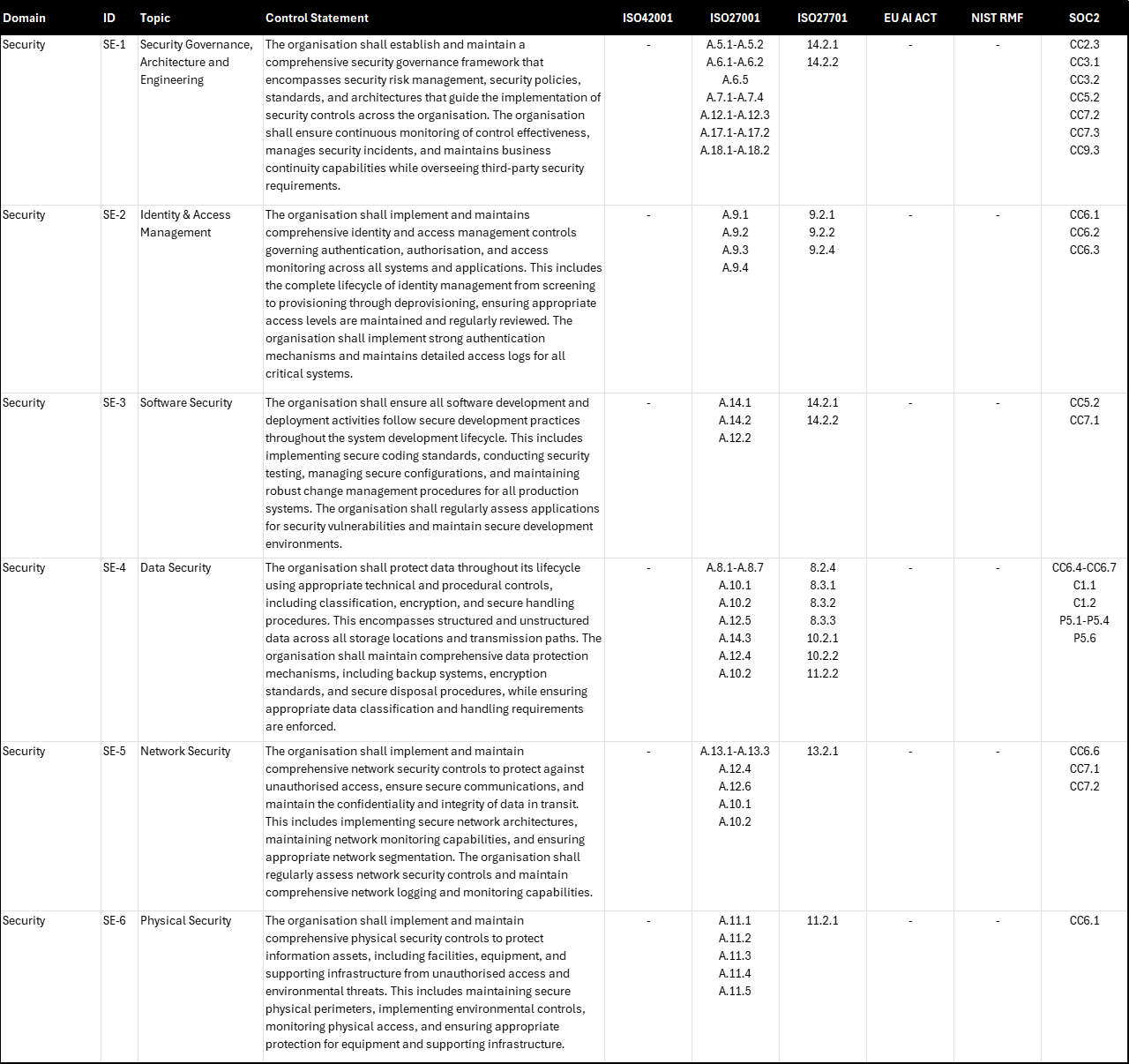 Security remains one of the most pivotal and complex domains in AI governance, because you have to figure out how to safeguard not only traditional IT infrastructure but also the unique components of AI systems—models, training data, and specialised hardware. ISO 27001 and ISO 27701 provide foundational security and privacy best practices, while SOC2 emphasises rigour in control effectiveness, continuous monitoring and cross-functional collaboration. Although ISO/IEC 42001 and the EU AI Act do not list discrete “security controls” in the same way, they both stress that high-risk AI systems demand protective measures to guard against emergent threats like adversarial attacks. Security is somewhat implied. Similarly with the NIST RMF AI, because security is addressed by many other NIST standards, in particular NIST 800-53 2. It’s a job for another day to map these master controls to the vast library of that standard though.