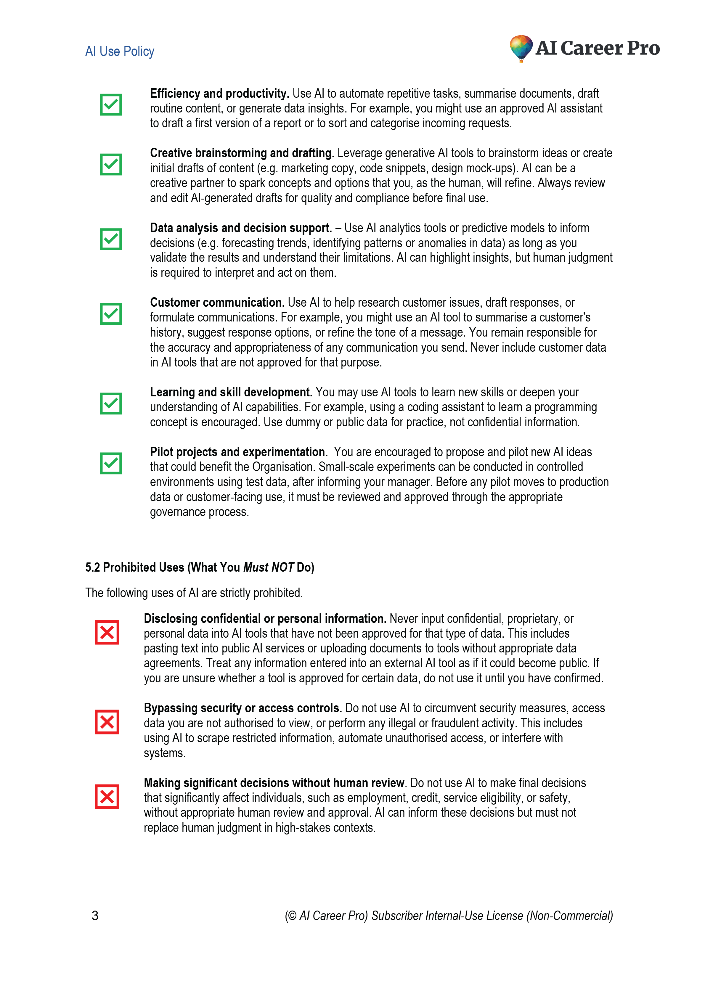 A use policy is operational. It translates your framework into daily guidance for everyone. What's encouraged, what's allowed with controls, what's prohibited. It needs to be accessible to any employee while remaining specific enough to provide genuine guidance.