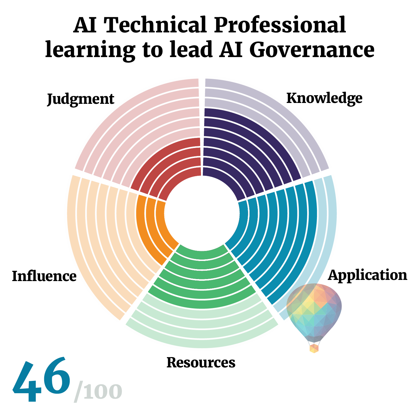 Then there's the practitioner who has been doing AI governance work for a couple of years. She's built real things: risk processes, inventories, review frameworks. She knows the standards, she's assembled a solid toolkit, and she understands the technology. Her knowledge, application, and resources scores are all strong. But she's hitting a ceiling. Her recommendations are sound, but they don't always land. She's not yet in the rooms where the consequential decisions get made, and when novel situations arise that don't fit neatly into existing frameworks, she defaults to process rather than reading the context. Her influence and judgment scores are where the growth needs to happen. That's the difference between a competent practitioner and one who can scale their impact across an organisation.