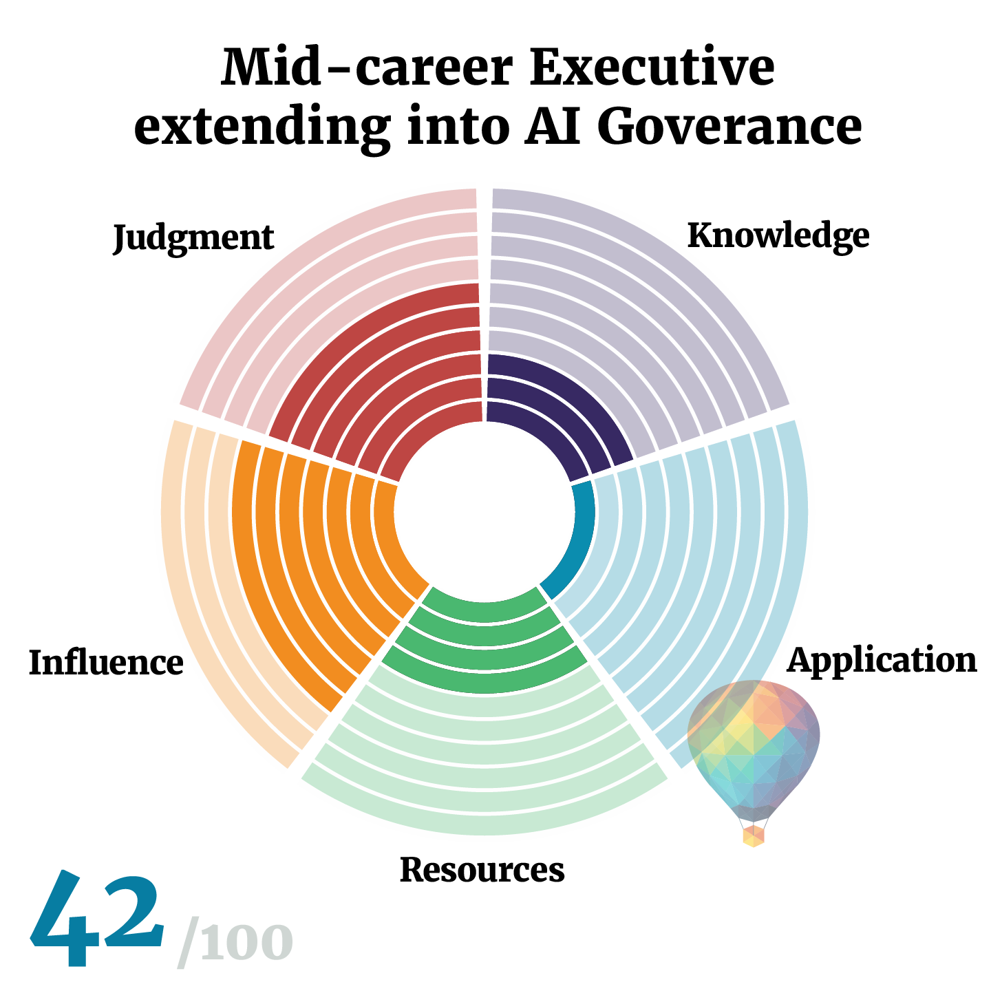 Now consider a mid-career executive moving into AI governance. She's spent years navigating complex organisations, building coalitions, and getting things done across functions. She has access to established frameworks, standards, and professional networks. Her influence, judgment, and resources scores are strong. But her technical knowledge of AI systems is shallow, and she's never designed a governance process from scratch. She's managed programmes, not built mechanisms. Her knowledge and application scores are low. Her development path is different: she needs to build genuine technical literacy and get her hands dirty with the craft of governance design.