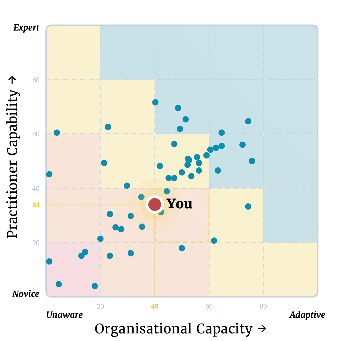 When you plot practitioner and organisational scores together, the picture gets richer than either assessment alone can provide. A strong practitioner inside an organisation with low capacity faces a difficult challenge: they know what to build, but they need to focus on making the case for investment, securing mandate, and building the organisational conditions that will let their work stick. A developing practitioner inside an organisation with strong capacity faces a completely different one: the structures and mechanisms are there, the leadership support exists, and the priority is their own professional development to make use of the opportunity in front of them.